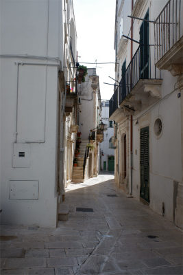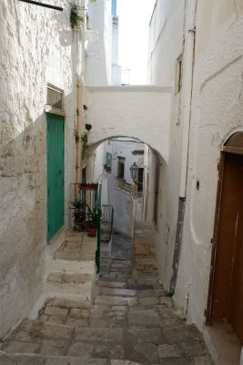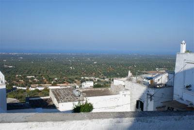 場所はアルベロベッロの一つ先で、先日訪れたマルティーナ・フランカの一つ手前、イトリアの谷を望む高台(標高400mくらい)にあります。ちなみに、ロコロトンドとは「円形の場所」という意味で、小高い丘の上に円形をなした町に白い家々が立ち並び、ここも道は迷宮のようです。