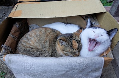 玄関先で体を寄せあってダンボール箱に詰まってます。マロちゃんは余裕の大あくび。