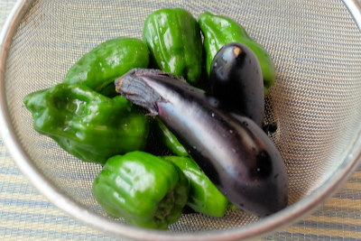 ナスはまだ大きくなると思いますが、来週からしばらく留守となるため、今なっているピーマンx6個とナスx2個を収穫いたしました。