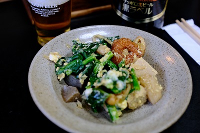 ほうれん草とベーコンのほかに、冷蔵庫にあった厚揚げが参加してます。サラダオイル+ごま油で炒め、オイスターソースで味付けました。