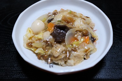 - 片栗粉、水、醤油、砂糖、鶏ガラスープ(顆粒)をよく混ぜて加え、混ぜながら、とろみがつくまで煮る。仕上げにごま油を回し入れる。