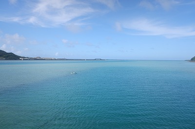 右中ほどに小さな島(奥武島)がみえますが、そこから左のほうに続く白いところが、ハテの浜