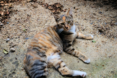 イチジクの木の下で横になるユキちゃん。とても懐いてます。夜間を含め、我が家の敷地内で過ごすことが一番多いです。
