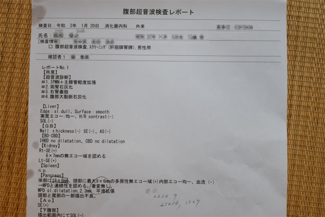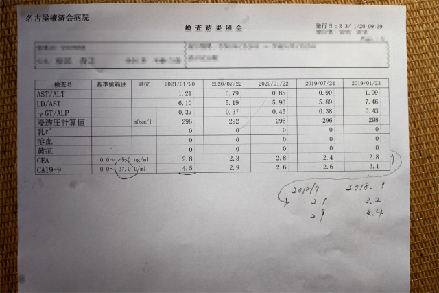 まずは、先日エキサイカイ病院で受けたIPMNの経過観察の結果を報告。併せて、血液検査のデータを渡しました。データを共有していただくことで、検査の回数を減らすことができます。