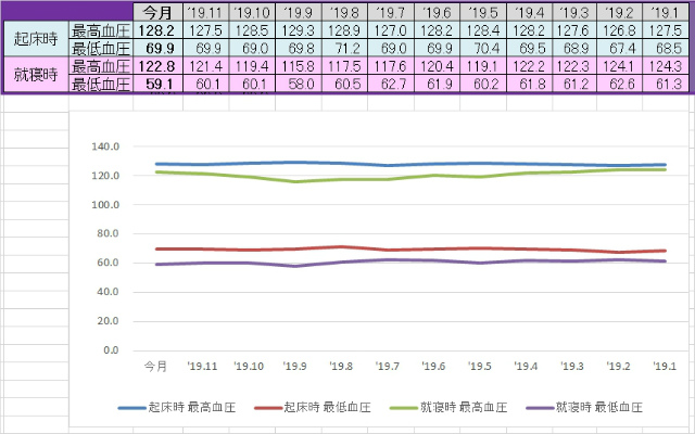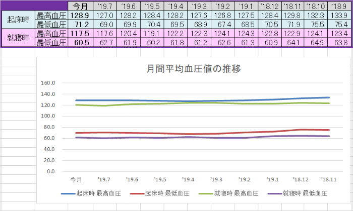 まずは血圧。月間の平均値は次のように推移しており、安定していると思います。